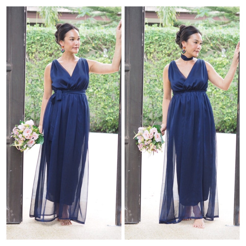 Navy Blue Dress Chiffon Bridesmaids Navy Blue Long Sleeve V Etsy